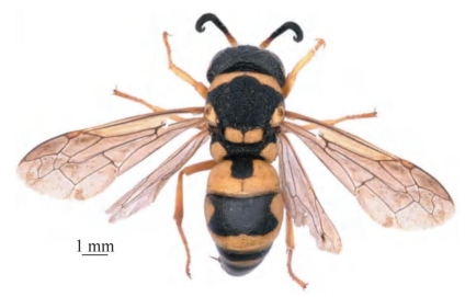 【形态特征】 体黑色,具大量黄色斑。头部后面观后单眼两侧的毛直、整齐;雄性触角第13节向后折回至第10节基部;雌性唇基宽明显大于长,雄性唇基宽约等于长,雌、雄性唇基端缘凹陷均明显较其他种类深;雄性唇基刻点浅、不明显,刻点间呈弯曲的小隆起;翅基片具明显的浅刻点。腹部第2节背板端部具极窄薄片,端部刻点明显较其余区域密,近端缘处略凹陷,腹部第2节腹板基部具明显的中纵沟。