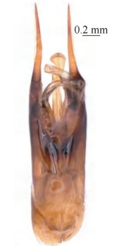【形态特征】 雌性头顶窝穴区较大,明显宽于两后单眼间距,两侧具大刻点,中央具小刻点和密集长毛;腹部第2节背板端部具明显薄片,薄片前的刻点较该背板其余区域的刻点密集且深;第2节腹板明显凸起,基部具1条短中纵沟。雄性触角第13节向后折回至第10节中部;雄性生殖器的抱握器端部圆形。