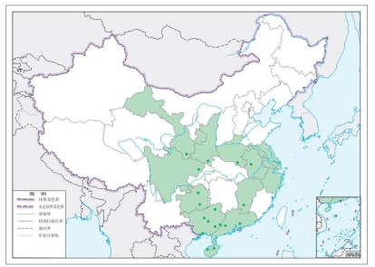 【地理分布】 上海、江苏、浙江、安徽(六安)、江西(赣州)、河南(信阳)、广东(云浮、惠州)、广西(桂林、玉林、防城港、来宾、岑溪、河池)、海南(昌江、定安、三沙)、四川(达州)、贵州(黔南、遵义)、陕西(安康)、甘肃(陇南);英属印度洋领地,毛里求斯,越南,马来西亚,印度尼西亚,日本。