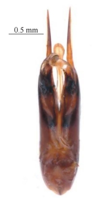【形态特征】 体黑色,具黄色斑,翅黑褐色,略具紫色光泽。雌性唇基宽与长相等,刻点由基部向端部变密集且深,端部具不明显侧脊,端缘凹陷不明显;前单眼后方、两后单眼内侧各具1个结节且中间断裂,此特征明显区别于该属其他种类。雄性腹部第2节背板端部薄片较雌性宽;雄性生殖器阳茎端部圆形,抱握器端部略平截,具稀疏毛,生殖刺突细长,并向端部逐渐变细。