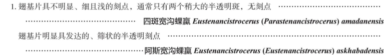 【形态特征】 唇基宽大于长,端缘弧形凹陷;雄性触角第13节向后折回呈钩状。翅基片后缘超过旁翅基片后缘;前胸背板无翅基片前脊;宽沟蜾蠃指名亚属Eustenancistrocerus的翅基片具密集、发达呈筛状的半透明刻点,旁宽沟蜾蠃亚属Parastenancistrocerus翅基片具不明显、细且浅的刻点,通常只有两个稍大的半透明斑。腹部第1节背区与前斜面具横脊分界,横脊与背区在同一水平面。