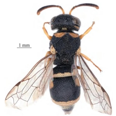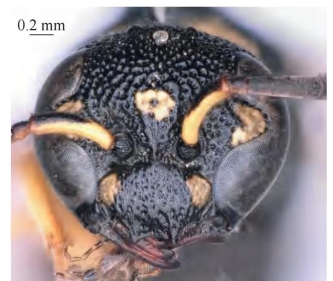 【形态特征】 体黑色,具浅黄色或黄色斑;其中雌性唇基基部具1对黄色侧斑,雄性整个唇基黄色,腹部各节端部具黄色条带,第1、2节背板分别具1对侧斑。体具粗糙刻点,头部和胸部刻点较腹部粗糙密集;唇基宽大于长(雌性宽明显大于长),密生浅刻点(雌性的刻点轮廓略模糊),端缘宽凹陷,两侧呈齿状;翅基片刻点不明显,细且浅,通常只有两个稍大的半透明斑点;并胸腹节背区和侧区边界具不明显齿状突。腹部第1、2节刻点较其他腹节粗糙。