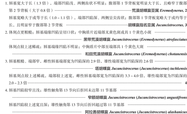【形态特征】 翅基片具密集的筛状半透明刻点;前胸背板无前胸脊;并胸腹节侧缘具薄片和齿突。荒漠胡蜾蠃亚属Eremodynerus的腹部第1节背板宽明显大于长,较腹部第2节背板稍窄(超过0.8倍),而胡蜾蠃指名亚属Jucancistrocerus的腹部第1节背板较长,宽略大于或几乎等于长,明显窄于腹部第2节背板(小于0.8倍);第1节背板具横脊,但横脊明显低于背区水平面并接近于背板基部,即横脊位于前斜面而非背区与前斜面的分界。