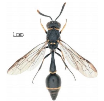 【形态特征】 体黑色,具大量浅黄色斑;翅浅棕色,前翅前缘浅黑褐色;唇基基部具大黄色斑,雄性黄色斑较雌性的更大。头部正面观长大于宽,头顶稍平;前单眼之前的窝穴长大于宽、浅、轮廓不明显;雄性触角第13节细长、稍扁,向后折回至第11节基部;并胸腹节亚缘脊薄片基部具齿突;腹部第1节背板膨大区域小于该背板长的1/2,该区域刻点不均一。
