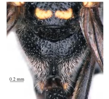 【形态特征】 体黑色,具大量黄色斑;雌性唇基除端缘外大部分为黄色,雄性唇基全为黄色;前翅缘室褐色。头部正面观长约等于宽且两侧圆弧形;前单眼之前的窝穴浅,椭圆形,稍大于前单眼,中部具1小撮短毛;并胸腹节亚缘脊薄片基部具齿突。腹部第1节背板膨大区域小于背板长的1/2。