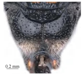 【形态特征】 体黑色,其中雌性唇基基部窄横带偏橘黄色;雄性唇基和上颚两者除外缘外全为黄色;翅浅棕色,前翅缘室浅褐色。雌性前单眼之前的窝穴明显,稍大于前单眼;前胸背板两侧肩角尖齿状且明显上翘;并胸腹节背区刻点稀疏,端部刻点较基部密,亚缘脊薄片基部无齿突。腹部第1节背板端部膨大区域小于该背板长的1/2。