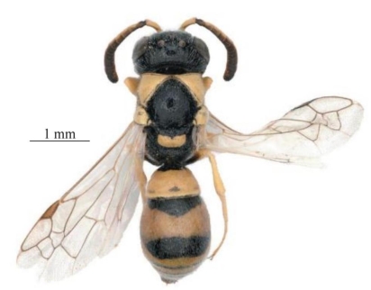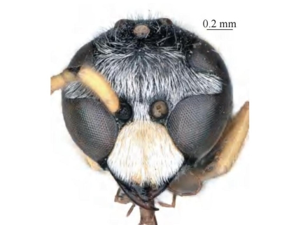 【形态特征】 体黑色,大面积淡黄色,明显具白色毛;体刻点细小,刻点间具光泽。唇基宽大于长,端部较深凹陷,两侧呈尖齿状,雌性唇基疏生白色短毛及小刻点;雄性唇基密生浓毛,仅端部齿可见。雄性额区类似唇基密被浓毛,刻点不可见;单眼大;雄性触角第13节向后折回至第11节基部;中胸侧板和并胸腹节侧区具连续的横皱;并胸腹节背区与后区之间无脊但具明显边界。腹部第2~4节背板端部分别具宽薄片,其中第2节薄片基部具1排大刻点,刻点间具短脊,第2节腹板侧面观弱隆起,基部具浅短中纵沟。