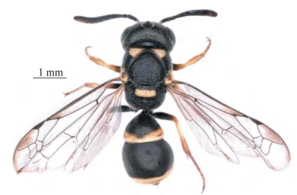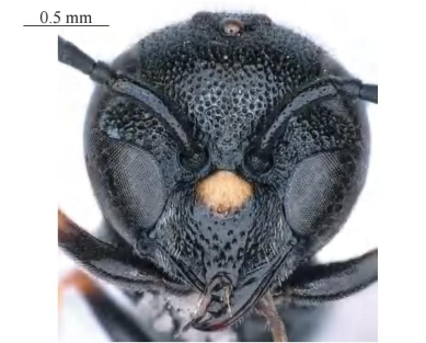 【形态特征】 体黑色,具浅黄色斑。头、胸部刻点较腹部密集。雌性唇基基部具黄色斑,密生粗大刻点,中部刻点稀疏,两侧及端部刻点较密,端缘凹陷较深、呈半圆形、凹陷基部光滑无刻点。前胸背板具三角形黄色斑;前胸脊不明显;并胸腹节背区和后区之间无脊,后区较光滑,外侧具稀疏刻点;中纵沟两侧具细皱,中纵脊短,仅在端部1/3处存在。腹部第2节背板端部薄片基部具1排大刻点,刻点间向端部延伸、呈脊状,第2节腹板侧面观强烈隆起,基部具短的中纵沟;雄性后足跗节第1节膨大。