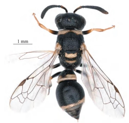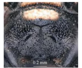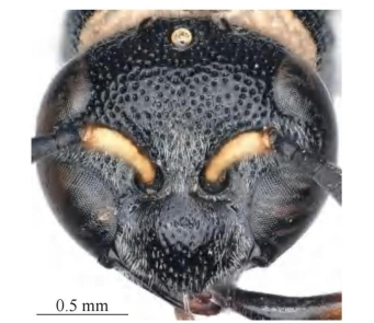 【形态特征】 体黑色,具淡黄色斑、大刻点;头、胸部刻点密集,腹部刻点较稀疏。唇基黑色,端缘浅凹陷,两侧具短齿,基半部具细密刻点,端半部刻点粗密,边缘具白毛;额区下侧具稀疏短白毛;后脊发达且在腹侧明显形成角度。前胸背板前端浅黄色,前胸脊较该属其他种类宽且透明;并胸腹节背区与后区之间具弧形短脊;后区上侧光滑、具稀疏刻点,无中纵沟和纵脊,由短横皱组成,后区下侧具长斜皱。腹部第2节腹板侧面观略隆起,基部具中纵沟。