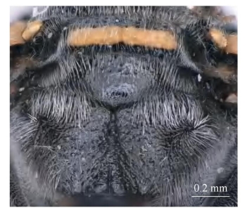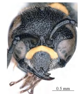 【形态特征】 体黑色,其中雌性唇基基部具弧形黄色条带,腹部第2节背板中部两侧具1对圆形侧斑。头部及胸部的毛较腹部长;头、胸部刻点较腹部刻点密;唇基密生细小的浅刻点,其中中部较两侧的稀疏,端缘呈半圆的深凹陷,两侧呈尖齿状,两侧密生白色短毛;并胸腹节背区密生长毛、与后区之间无脊,后区中纵沟较深且宽,中纵脊仅端部1/3处存在。腹部第1节背板背面观钟形,背板端部宽几乎与长相等;第2节背板端部黄色条带中间具1排透明大圆刻点,无纵脊,腹板侧面观强烈隆起,基部具浅中纵沟。