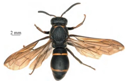 【形态特征】 体黑色,具少量黄棕色斑;雌、雄性唇基均为纯黄色,腹部第1、2节背板端部分别具窄的黄色条带;翅深褐色,半透明具紫色光泽,前翅缘室端部无黑色斑。雌、雄性唇基粗糙、密生浅刻点,端缘中部深U形凹陷,两侧明显呈尖齿状。中胸小盾片和后胸背板均无中纵沟;并胸腹节后区内侧光滑,基部窝穴呈三角形,约占后区中脊的1/5。腹部第2节背板端部具不明显的薄片,仅侧面观可见;雄性触角第13节向后折回至第10节端部。