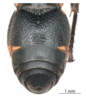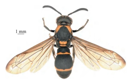 【形态特征】 体黑色,具黄棕色斑,其中唇基基部、前胸背板(除后缘外)、小盾片、后胸背板,腹部第1、2节背板端部的条带为黄棕色;翅褐色,前翅缘室端部具黑色斑。唇基疏生刻点,刻点间具散生微小刻点,端缘中间呈V形凹陷;头顶窝穴间距约为后单眼间距的0.5倍,后单眼至后头脊的距离约为后单眼至复眼内缘距离的1.7倍。中胸小盾片具浅中纵沟;并胸腹节后区基部窝穴圆形,约占后区中脊的2/5。腹节粗糙革质,第2节背板端部具窄的薄片,第2节腹板侧面观从基部至端缘明显隆起,正面观两侧明显隆起,基部中间凹陷且具纵沟。