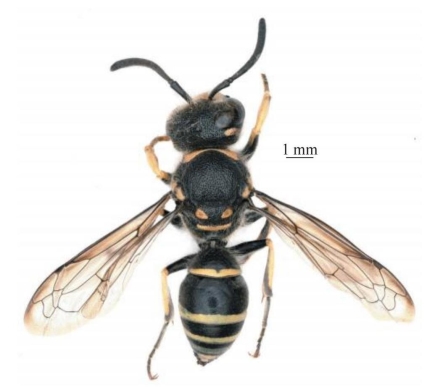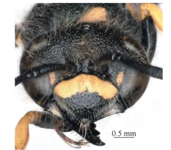 【形态特征】 体具白色长柔毛;体黑色,具黄色斑,其中唇基基部、前胸背板、翅基片外侧、小盾片1对侧板、后胸背板、足胫节外侧及腹部第1~6节背板端部条带均为黄色。唇基中部略隆起、呈扇形,端部微凹,两侧呈短齿状,刻点中等密度(间距小于或等于刻点直径);触角间脊微凸出;头顶窝穴不明显。中胸小盾片具浅中纵沟;后胸背板端部光滑无刻点。