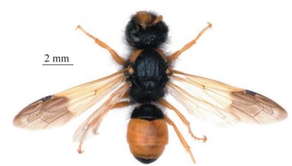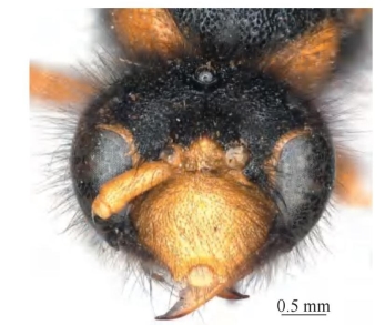 【形态特征】 头部、胸部刻点较腹部大且密集;头部、胸部及腹部第1节具浓密黑色长柔毛;体黑色,具大面积橘黄色斑,其中唇基、前胸背板、足(除基节外),腹部第2、3节为橘黄色。雄性触角12节;前翅端部褐色;雄性唇基密生刻点及长毛,刻点间光滑,端缘呈半圆形凹陷,两侧呈钝齿;眼窝及额区中部的毛较头部其他部位浓密;额区、头顶、颊区具密集粗刻点,以上部位的刻点比唇基大且密集。中胸盾片的毛较以上部位更稀疏,基部至端部具2条完整的盾纵沟;小盾片明显凸起高于中胸盾片,具中纵沟;后胸背板背面平,后垂直面中间光滑无刻点。腹部革质,疏生细浅刻点。
