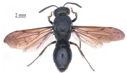 【形态特征】 除部分标本足腿节为红褐色外,体几乎全为黑色,其中雄性唇基(除两侧外)为淡黄色;翅黑褐色,具紫色光泽。并胸腹节背区与后区间的围脊发达,后胸背板后具1对大的三角形齿突;腹部第2节背板刻点中等密度,不大于中胸盾片的刻点;雄性抱握器窄而长、刀片状、两侧直。