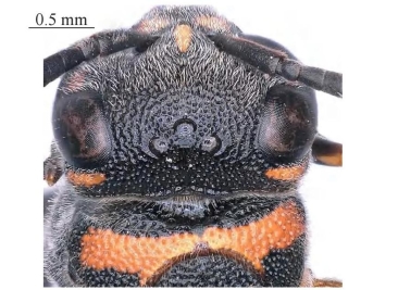 【形态特征】 体黑色,具黄色至黄棕色斑。雌性唇基基部具1对侧斑;唇基宽略大于长,中部平坦,两侧具纵脊,疏生刻点和发达纵皱,端缘平截;后头脊后部发达,中间弯曲呈切口状。前胸背板密生刻点,呈网状,前斜面中部具1对不明显的窝穴,大小与周围刻点类似,两侧具密集网状刻点;小盾片凸起,从侧面观与中胸盾片不在同一水平面;后胸背板向后倾斜,密生刻点;中胸侧板后端略凸起。雄性唇基除边缘外为黄色,疏生细小刻点,端缘凹陷,两侧呈齿状;雄性触角第13节扁平及弯曲,末端宽大,向后折回至第11节基部。