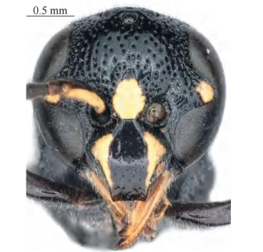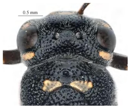【形态特征】 体黑色,具少量黄色斑。唇基宽略大于长,中部平坦,具零星略较大的刻点和疏生细小刻点,端缘平截状,唇基整体略呈光滑的铲状;头顶中部沿后头脊明显具1排短纵脊;额区两侧密生刻点、中部疏生刻点且刻点间光滑并具零星微小刻点;头顶后区凹陷、后头脊完整,中部明显发达、具浓密短毛。前胸背板前斜面中间具1个向下凹的深窝穴,窝穴下侧光滑无刻点、两侧密生刻点;中胸小盾片平、从侧面观与中胸盾片在同一水平面;后胸背板几乎水平。