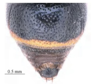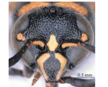 【形态特征】 体黑色,具黄棕色斑。雌性唇基宽略大于长,中部平坦,两侧无纵脊,基部疏生小刻点,端部密生大且深的刻点,刻点间略呈纵脊,端缘近平截状、略凹陷。前胸背板前斜面中间具 1对不明显窝穴;中胸小盾片凸起,从侧面观与中胸盾片不在同一水平面;中胸侧板背后端具钝齿状突起。雄性触角第13节短小,几乎与第12节等长,指状且几乎笔直;雄性腹部第7节腹板基部具1排棕色的浓密长毛。