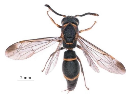 【形态特征】 体黑色,具黄棕色及红棕色斑,其中唇基纯黄色;前翅缘室端部具黑褐色斑。唇基密生大而浅的刻点,后头脊完整;雄性触角第13节极长、向后折回至第10节中部。前胸背板前斜面中间光滑,具小且分离的窝穴,后胸背板具锯齿突;并胸腹节上侧脊微弱不清晰。腹部第1节背板宽略大于长(近似相等)、基部横脊完整;第2节背板近端缘具1排极大的规则刻点,刻点较密且未到达端缘、略凹陷,端缘光滑且明显具弧形延长、具透明薄片;第2节腹板基部平坦、无中纵沟;第3节背板及腹板端部无延长。