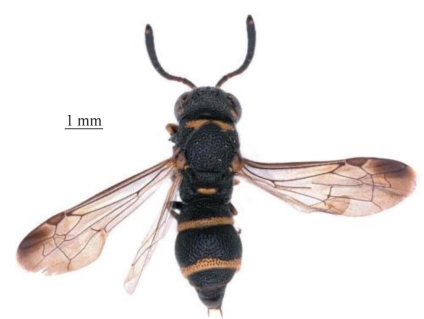 【形态特征】 体黑色,具黄色斑,其中第2节背板端部黄色条带呈波浪状,前翅缘室明显具黑褐色斑。雄性唇基光滑,端缘中部浅弧形凹陷、两侧呈短齿突;后头脊不完整、在顶端缺失;雄性触角第13节短,向后折回至第11节基部。前胸背板前斜面中间光滑,具小且分离的窝穴,两侧具刻点;后胸背板具锯齿形突;并胸腹节上侧脊完整且清晰。腹部第1节背板宽明显大于长,基部横脊完整;第2节背板端部无延长、亚端部具两排大而规则的刻点且到达端缘,该区域略凹陷;第2节腹板基部平坦、具极浅中纵沟;第3节背板及腹部端部均延长且发达。