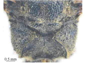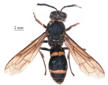 【形态特征】 体黑色,具黄色斑,其中唇基纯黄色,腹部第1、2节端部具宽的黄色条带,翅明显褐色,几乎不透明。头顶窝穴明显大而凹、密生长的棕色柔毛、窝穴区域外缘超过后单眼外缘且接近复眼内缘;唇基宽大于长(宽约为长的1.26倍),密生浅刻点,刻点轮廓不规则,端缘浅弧形凹陷。后胸背板明显具中纵沟,并胸腹节围脊上端明显呈宽的大切口,且顶端在后胸背板后面形成1对锋利的齿,脊呈弧形、不明显弯曲。腹部第1、2节背板端缘明显具薄片。