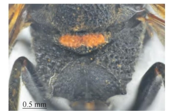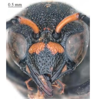 【形态特征】 体黑色,具棕色斑,唇基基部具1对几乎相连的棕红色大斑(有时端部具1对小斑),翅棕褐色,腹部第1~4节背板或第1~3节背板端部分别具1条黄棕色条带。头顶窝穴无浓毛,窝穴区外缘略超过后单眼外缘;唇基密生刻点,两侧具不明显侧脊,端缘中部浅弧形凹陷,两侧齿突不明显。小盾片和后胸背板均无中纵沟;中胸侧板侧纵脊弱,几乎退化;并胸腹节水平区略短于后胸背板的1/2,围脊非完整弧形、围脊边缘明显多处弯曲、中部切口宽、大V形。腹部第2、3节背板端缘分别具薄片。