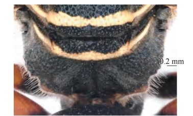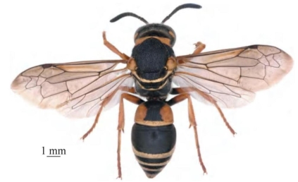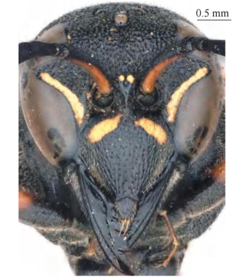 【形态特征】 体黑色,腹部第1~4节背板端部分别具淡黄色条带,雌性唇基基部侧斑、颊区1小斑、雄性触角第13节、前胸背板基部、翅基片、旁翅基片,足除基节、转节和腿节基部外及腹部第1节背板两侧(有时两侧斑相连)均为棕红色;雄性唇基和上颚除端缘外、复眼内缘下侧细条带、中胸小盾片亚端的横带、中胸侧板背侧的小斑及后胸背板后端为淡黄色。唇基宽略大于长(1.1倍),雌性唇基端缘中部呈V形切口状凹陷,端半部刻点规则排列、呈纵沟状;雄性唇基端缘中部呈深U形凹陷。并胸腹节背区与侧区之间的侧脊具明显齿突,背区和后区之间的横脊薄而不明显。腹部第1节背板基部无外侧脊。