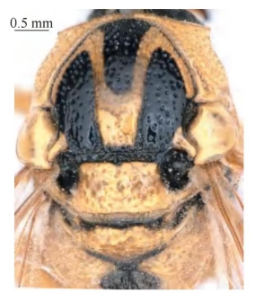 【形态特征】 体底色为黑色,但绝大部分为浅黄色(略偏绿色),中胸盾片具1条贯穿背板中部的M形黄色斑,腹部第1、2节背板基部具少量黑色斑,前翅端缘略褐色。唇基长略大于宽,稀生浅刻点,端缘平截状。中胸盾片和小盾片稀生刻点,刻点间隙光滑且具光泽;并胸腹节背区与侧区之间的侧脊具齿状突,背区和后区之间的横脊完整而清晰。腹部第1节背板基部无侧脊,第1~5节背板端部刻点较其他区域更密。