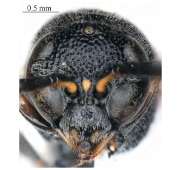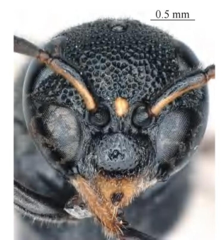 【形态特征】 体黑色,具少量黄色斑;前翅密生短毛,缘室端部具黑褐色斑;体密生粗糙刻点。雌性唇基宽略大于长,中部凸起,疏生小刻点,端缘中部凹陷,两侧呈尖齿状;触角间脊微凸;单眼区隆起。雄性唇基端部凹陷较雌性深,两齿后侧具纵黄色斑或无斑。雄性触角第12、13节非常细且短小、肉眼几乎不可见。腹部第1节长大于宽,基部横脊发达、几乎与背区后缘平行,端部近略宽于基部,背区刻点略大于中胸盾片的刻点,明显呈网状;第2节背板端缘具窄的透明薄片,背区刻点较第1节背板的稀疏,非网状,近端缘处刻点密集且未到达边缘。