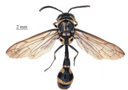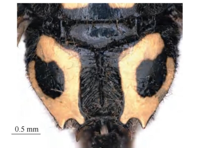 【形态特征】 体黑色,具大量黄色斑,其中雌、雄性唇基(除边缘外)为纯黄色,中胸盾片具1对倒V形黄色斑(偶有标本倒V形斑中断),并胸腹节背后区具大的回字斑,背区中间黑色延伸至边缘。雌性唇基长略大于宽(1.1倍),端缘中部凹陷,两侧呈齿突状,端部宽约为唇基宽的1/5,散生浅刻点;雄性触角第13节向后折回至第11节基部。并胸腹节背后区及腹部第1节背板疏生细小刻点;雄性中胸盾片刻点较雌性稀疏;并胸腹节背后区两侧光滑、几乎无刻点。腹部第1节腹板中部至端部具短横皱。
