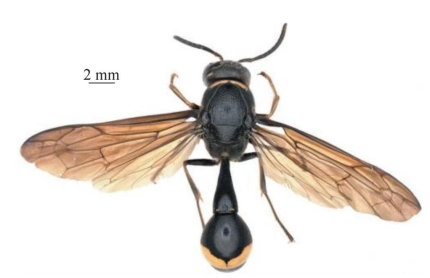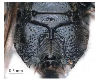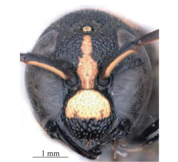 【形态特征】 体黑色,具少量黄色斑,其中唇基(雌性唇基基部)、额区大斑、前胸背板前缘的窄条带及并胸腹节后端的斑、腹部第1节背板端缘窄的小斑及第2节背板宽的条带均为黄色。雌性唇基长约等于宽,端缘中部凹陷、两侧呈尖齿状;并胸腹节背后区及腹部第1节背板密生刻点;雄性触角第13节向后折回至第10节端部,刻点稍稀疏。腹部第1节腹板中部至端部无明显横皱、端部密生刻点。