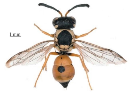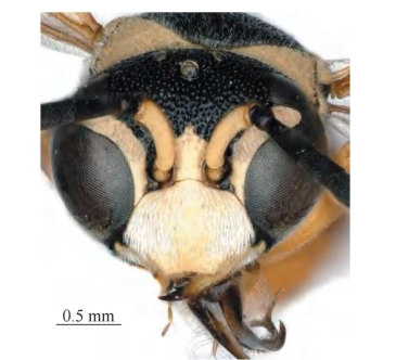 【形态特征】 体黑色,具大面积棕红色斑,其中头部除额区中部两侧、头顶及触角鞭节外为红棕色(额区的斑未与唇基连成一体),胸部除中胸盾片(基部具不明显的窄侧斑)及并胸腹节沟周围外为红棕色(雄性头部及胸部相应区域为淡黄色),腹部第1、2节除第2节背板中部的小黑色斑外几乎全为棕红色(雄性为黄棕色);雌性前翅从中部至端部几乎全为黑褐色。下颚须发达,两侧具均匀长柔毛;中舌瓣发达,尖端分叉,细长,长于胸部;唇基宽大于长、凸起呈扇形,端缘中部平截状,密生浅刻点(中部刻点较两侧的稀疏),刻点间光滑,其中雄性唇基明显密被白毛;雄性触角第9~13节逐渐变细,向后卷曲。