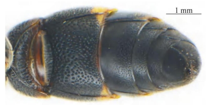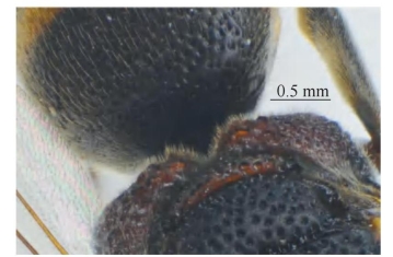 【形态特征】 体黑色,头部及腹部具黄色斑,胸部具暗红棕色斑,其中唇基(除中部黑色斑外)几乎全为黄色,前胸背板、后胸背板基部、并胸腹节及翅基片大部分为暗红棕色。唇基密生粗糙刻点、呈网状,端缘中部深弧形凹陷,两侧呈尖齿状。翅基片半圆形;并胸腹节背区在后胸背板后具2枚齿突。腹部第2节背板和腹板均密生粗糙大刻点,其中腹部刻点较背板的明显更密且大,背板端缘明显具刀片状薄片。