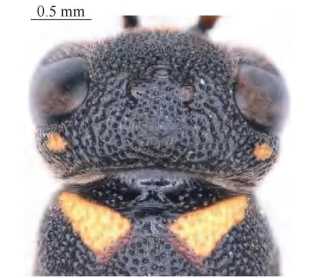 【形态特征】 体黑色,具大量黄色斑,其中雌性唇基基部具1对黄色斑(斑有时相连),腹部第1、2节背板端部具宽的黄色条带,翅黑褐色,具紫色光泽。唇基宽大于长,具中等密度刻点,端缘中等凹陷;前胸背板前面倾斜、具明显刻点,窝穴明显V形;后胸背板中纵沟明显,且将背区明显分成两部分。腹部第1节背板前斜面圆弧形、密生粗糙刻点,第1、2节背板端部刻点明显更密、到达端缘,近端缘前呈横沟状,端缘略反翘,第2节腹板基部具1条中纵沟,基角为钝角。