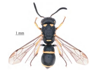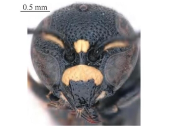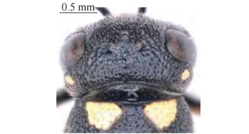 【形态特征】 体黑色,具黄色斑。雌性头顶窝穴小,不明显;雄性触角第13节较宽;唇基宽略大于长,具不均匀刻点,整体散生浅刻点,从中部至端部具侧纵脊,端部呈铲状,端缘中部微凹陷;雄性触角第11节腹面凹陷,第13节向后折回至第11节中部,钩状的端缘较钝。前胸背板前垂直面的窝穴明显V形;后胸背板中纵沟明显且将背区明显分成两部分。腹部第2节腹板基部具1条短中纵沟,有时退化状。