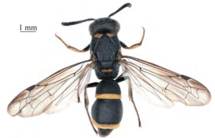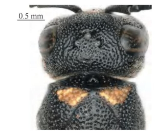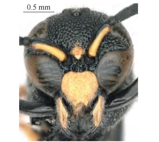 【形态特征】 体黑色,具黄色斑,雌、雄性唇基纯黑色,复眼窝无黄色斑。雌性唇基无侧纵脊,雌、雄性唇基均明显密生刻点,端缘中部凹陷深,两侧明显呈齿状;雌性头顶窝穴小而深,略大于其后区刻点;整个胸部密生粗糙网状刻点,较头部的略大。前胸脊中间间断,前斜面几乎垂直,疏生刻点,窝穴明显呈V形;翅基片光滑;后胸背板中沟明显;并胸腹节背区和侧区密生网状刻点,刻点明显大于胸部其余部分的刻点,后区凹陷,密生均匀的刻点,呈网状,下部具短中纵脊。腹部第1、2节背板密生刻点,其中第1节背板的刻点较第2节背板的略密且大;第2节背板接近端缘处刻点明显密集致该区域略凹陷,端缘略向上反翘,端缘光滑、无刻点。