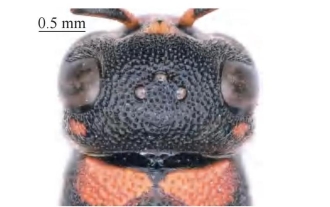 【形态特征】 体黑色,具棕红色斑,翅褐色,前翅缘室具黑褐色斑。唇基中央凸起,宽略大于长,具粗糙刻点,其中端部刻点较基部大、刻点间略呈脊状,端缘中部中度凹陷、两侧齿状明显;额区和头顶密生网状刻点;头顶窝穴退化状,几乎与周围刻点等大,不能明显分辨。前胸背板前斜面的V形窝穴开口较宽;翅基片散生浅小刻点。腹部第1节背板宽几乎等于长,端部明显宽于基部,前斜面圆弧形;第2节背板端部近端缘具1排较浅且稀疏的刻点,形成1条横沟,刻点未到达端缘,端缘光滑、向上反翘;雄性抱握器端缘略平截状。