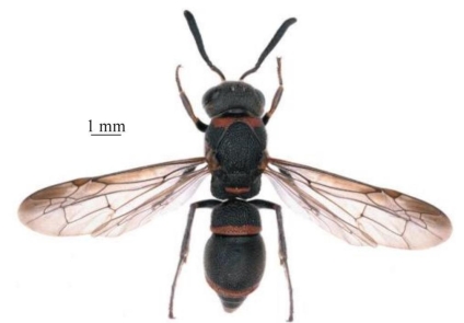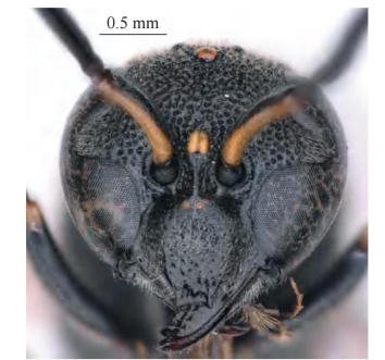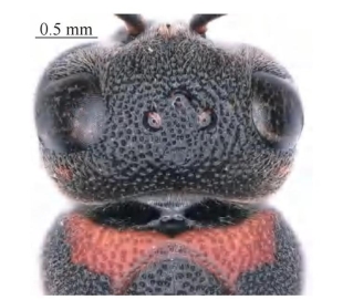 【形态特征】 体黑色,具大量红棕色斑,前翅前缘至端部为黑褐色。唇基中央凸起,宽略大于长,稀生刻点,侧脊退化状,端缘略凹陷;头顶窝穴退化状,几乎与周围刻点等大。前胸背板具1对相连的窝穴,但未融合成一体;后胸背板无中沟;并胸腹节背区和侧区密生大网状刻点,刻点明显大于胸部其余部分的刻点,围脊中度发达,后区凹陷,具长的横脊和完整中纵脊。腹部第1节背板宽大于长,前斜面几乎与背区垂直,具零星刻点,斜面上半部分具中纵脊;第2节背板端缘前密生刻点,呈凹陷的窄横沟状,刻点接近边缘,端缘呈窄的薄片状、向上反翘。