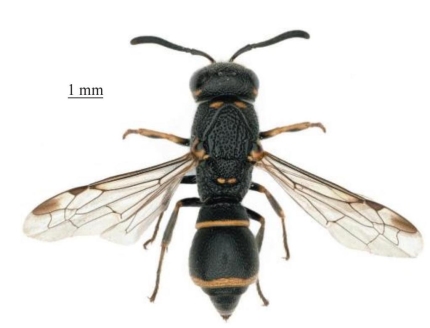【形态特征】 体黑色,具黄色斑;前翅缘室端部具褐色斑。雌性唇基宽略大于长,从基部至端部纵向绝大部分平坦但不凹陷,疏生刻点及长毛,端缘中部略凹陷;雄性唇基除中间和端部外为黑色,凹陷较雌性深;雄性触角第7~10节腹面凹陷,第13节基部两侧略向内凹陷、中部宽、端部窄。并胸腹节背区具蜂窝状刻点,侧区上部具刻点、下部具横皱,后区凹陷,中间具完整中纵脊,两侧具横皱。腹部第2节腹板密生刻点,背板及腹板近端缘分别具1排深刻点,呈横沟状。