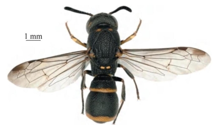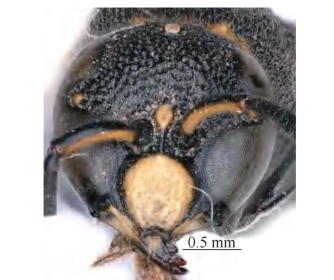 【形态特征】 体黑色,具黄色至棕黄色斑;前翅缘室端部具浅褐色斑。唇基长略大于宽,雌性基部刻点较端部密,平坦区几乎从基部至端部、不凹陷,端缘部略凹陷,两侧呈齿突状,雄性唇基端缘凹陷较雌性深。额区和头顶密生网状刻点,颊区密生刻点不呈网状;雄性触角第8~10节腹面无明显深凹陷,第13节仅端部较基部略窄。前胸背板前垂直面中间具1对圆窝穴,两边疏生刻点。腹部第1节背板具密集刻点,第2节背板及腹板近端缘的刻点不明显更密集,未明显呈横沟状。