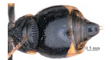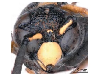 【形态特征】 体黑色,明显具黄色斑。雄性触角第9~13节腹板具短纵脊突。胸部密生短毛,短毛中间具稀疏长毛,中胸侧板具稀疏中刻点和褶皱;中胸盾片具完整的盾纵沟,小盾片具宽的中纵沟,小盾片刻点较盾片的密;并胸腹节背区较窄,刻点粗糙,中央具1个大的圆窝穴,密生平底大刻点,刻点间脊发达,明显呈网状,围脊不发达;侧区上部具粗糙刻点,下部具横脊,后区凹陷,中间具完整中纵脊,两侧具横皱。腹部第1节背板具更密集刻点,中部具宽的纵凹陷,背板明显短宽且宽大于长,端缘宽于横脊,腹板基部无横脊;第2节背板基部刻点略密且大,其余区域具零星细小刻点。