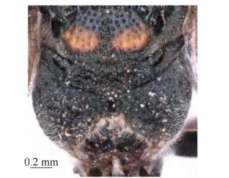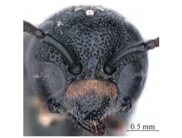 【形态特征】 体黑色,具棕色斑,其中唇基基部、前胸背板前基部、小盾片后端1对斑,腹部第1、2节背板及第2节腹板端部宽的条带为棕色。唇基宽略大于长,具稀疏刻点,密生短毛,端缘平截状;后头脊不完整,中部具2个切口而成1枚齿突。胸部密生短毛,短毛中间无稀疏长毛;中胸盾片具完整的盾纵沟,小盾片具宽的中纵沟,盾片和小盾片具粗糙的刻点,大刻点间密生细小刻点;并胸腹节背区较窄,刻点粗糙,中部窝穴相对窄小,侧区上部疏生横皱、下部横皱更密集,后区呈大的空凹陷,背区延伸将后区包围,中间具完整中纵脊。腹部第1节背板宽大于长,端缘平行且略长于横脊,背区具明显中纵沟,疏生刻点;腹板基部具横脊;第2节背板的刻点与第1节的类似,但略小,腹板刻点较背板更稀疏。