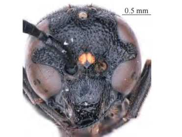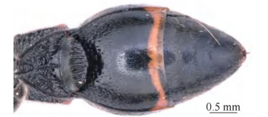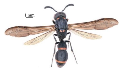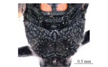 【形态特征】 体黑色,具红棕色斑,前翅黑褐色。唇基宽略大于长,具密集小刻点,密生短毛,端缘略凹陷,两侧略呈齿状。胸部密生短毛,短毛中间稀生长毛,前胸背板具中等密度刻点,两侧具横皱;中胸侧板的侧纵脊弱;并胸腹节背区粗糙,密生平底刻点,明显呈网状,中央具1条纵向的锥形窝穴;侧区上部具粗糙刻点,下部具横脊,后区中间具完整中纵脊,两侧密生横皱。腹部第1节背板长略大于宽,端缘平行且略长于横脊,密生刻点,呈网状,刻点未到达端缘,具明显中纵沟,腹板基部无横脊;第2节背板除基部散生刻点外,其余各节刻点细小、不明显,近似皮革状;第2节腹板基部呈弧形斜面。
