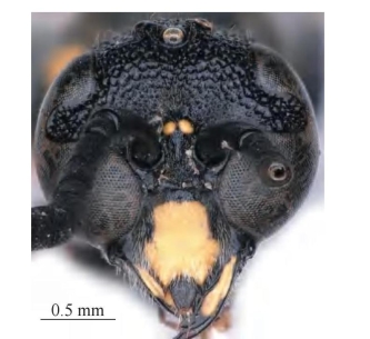 【形态特征】 体黑色,具黄色斑;唇基端部凹陷深,具粗糙中刻点,稀生短毛。胸部密生短毛;前胸背板刻点较额区稀疏,两侧具更粗糙刻点;前胸脊完整,肩角不明显;中胸背侧片具稀疏刻点;并胸腹节背区密生平底刻点,中部深窝穴非圆形,侧区具有光泽的大刻点,围脊不明显。腹部第1节背板宽略大于长,几乎无刻点、仅比其余背板多零星的刻点,背区中纵沟窄而深、从基部延伸至近端部,端缘平行且略宽于基部横脊;第1节腹板具中纵脊,纵脊端部具1条横脊,侧斜脊突出。