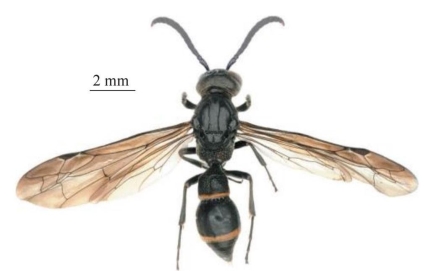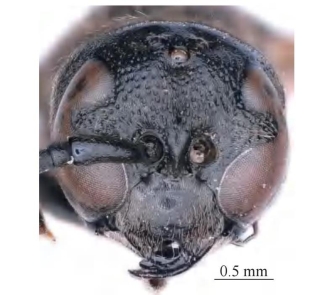 【形态特征】 体黑色,仅腹部第1、2节背板及第2节腹板端部具黄色条带,翅为黑褐色。唇基端部明显深U形凹陷,具中等密度的小刻点,密生短毛。胸部密生短毛,短毛中间有稀疏长毛;前胸背板具稀疏刻点,两侧具粗糙刻点,前胸脊完整,肩角明显;中胸盾片及小盾片皮革状、具零星刻点;前者具完整的深盾纵沟,后者具中纵沟,并胸腹节背区密生平底的网状刻点,中央窝穴大而深,上端宽、下端近端部明显收缩变窄。腹部第1节背板宽略大于长,端缘平行且长于基部横脊,背区粗糙、密生刻点(刻点轮廓模糊),中纵沟不明显,呈宽凹陷;第1节腹板基部具横脊;第2节背板端缘具窄的薄片;第2节及其余各节背板仅具零星刻点,近似皮革状。