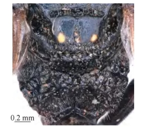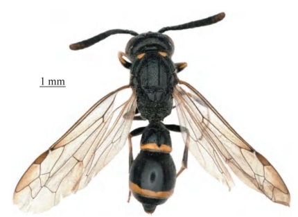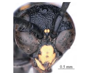 【形态特征】 体黑色,具黄色斑。唇基端部凹陷深,密生微小刻点。前胸背板疏生刻点,两侧具横皱;前胸脊完整,肩角发达;中胸盾片及小盾片散生刻点,其中盾片刻点明显更密,中胸盾片具完整盾纵沟,小盾片具中纵沟;并胸腹节背区窝穴小圆形,几乎与背区刻点等大,侧区具光泽,疏生大刻点。腹部第1节背板宽大于长,端缘平行且大于基部横脊,背区仅具零星小刻点,中纵沟深;第1节腹板中纵脊端部具横脊;第2节背板端缘具薄片;第2节及其余各节背板仅具零星刻点,近似皮革状。