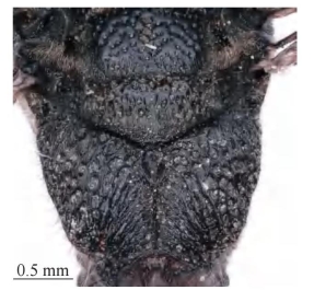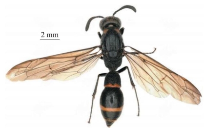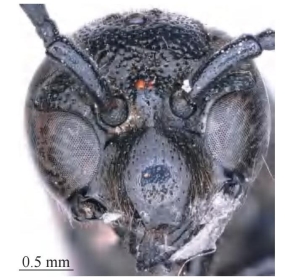 【形态特征】 体黑色,具红棕色及黄棕色斑,其中颊区上端的小斑、前胸背板基部1对斑、腹部第1节背板及腹板端部条带均为红棕色,额区小斑、雄性唇基、触角腹侧,以及腹部第2、4节背板端部条带常为黄棕色。雌性头顶窝穴周围脊状突起;雄性触角腹面无脊突;雌性唇基宽略大于长,两侧较中部密生刻点及毛,端缘中部略凹陷,两侧未明显呈齿突。前胸背板前半部密生刻点,后半部疏生刻点,在两侧更密集;前胸脊完整,无肩角;中胸盾片及小盾片具中等密度刻点,刻点间距等于或略大于刻点直径,中胸盾片具完整盾纵沟,小盾片中纵沟不明显、退化状;中胸侧板的侧纵脊发达,或者在腹侧发达;并胸腹节背区密生平底的大刻点,呈网状,中部窝穴似小椭圆形而下端明显收缩变窄,后区密生细长斜纵皱。腹部第1节背区及前斜面均密生刻点,呈网状,背板宽大于长,端缘宽大于基部横脊,横脊在两侧较弱或缺失,第1节腹板无中纵脊和横脊;第2节背板端缘具窄的薄片,基部密生刻点,除此之外其余背板及腹板仅具零星刻点、近似皮革状。