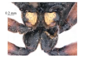 【形态特征】 体黑色,具大量黄色斑,其中后胸背板为黄色,足从腿节基部至腹部末端为红棕色。唇基明显宽大于长,中部隆起,疏生不规则的浅刻点,端部U形深凹陷,两侧明显呈尖齿状。前胸背板前斜面皮革状,具微小刻点;前胸脊在中部及肩部完整,腹侧消失,侧区刻点较胸部其他区域稀疏、刻点直径与间距相等,两侧缘刻点相对密且大;中胸盾片及小盾片均密生网状刻点,中胸盾片无盾纵沟,小盾片无中纵沟、仅略凹陷;并胸腹节背区与侧区分界处无锋利的边。雄性中足基节腹侧凹陷、光滑。腹部皮革状,密生细小刻点。