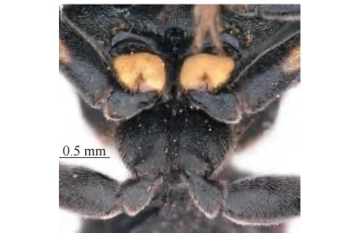 【形态特征】 体黑色,具黄色斑,其中雌性唇基基部具完整的黄色横条带,雄性唇基全为黄色;后胸背板黑色,翅基片前后缘分别具1个小黄色斑,腹部背板第1~5节和腹板第2节分别具黄色端带,无侧斑。唇基宽大于长,雌、雄性唇基端缘均深U形凹陷,中部略隆起;雌性唇基两侧及基部密生刻点,其中两侧刻点间具细的、不规则的纵皱,中部刻点更稀疏且更大,雄性唇基具更浅且较稀疏刻点;雄性中足基节正常,无凹陷;其余特征与凹足弯触蜾蠃Tropidodynerus (Tropidodynerus)concavus类似。