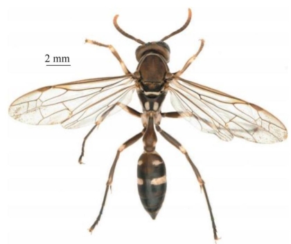 【形态特征】 体棕褐色至黑色,浅色斑为象牙白色,其中中胸盾片几乎全为棕褐色,偶具1对不明显的窄条带;后胸背板末端具深棕色或黑色斑点;翅透明,无深色斑;腹部第1~3节背板分别具1对象牙白色的侧斑。唇基宽大于长。后胸背板五边形,密生短刚毛,基部中纵脊明显;并胸腹节倾斜,具中纵脊,几乎无横皱。腹部第1节背板端部较宽,腹柄长分别为端部宽的2.5倍、为端部高的3倍。